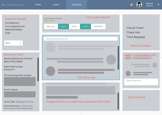 To come up with user flow where an incoming customer request is handled by an Agent at Wonder Airline support with assistance from various routes (other agents/ Agent team lead / artificially intelligent entity).
